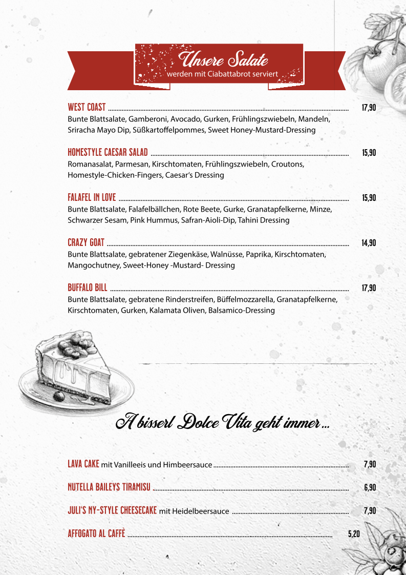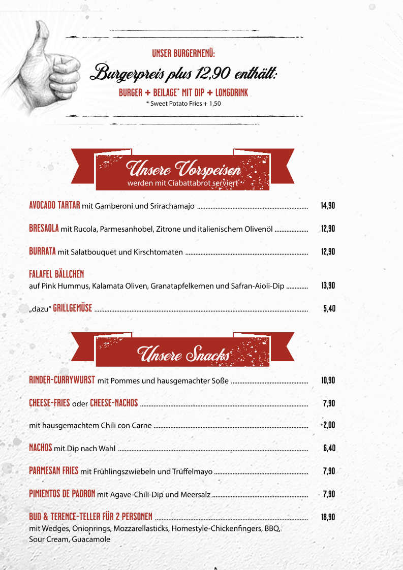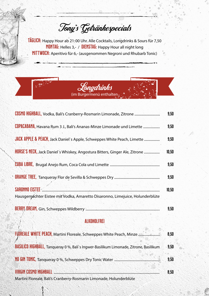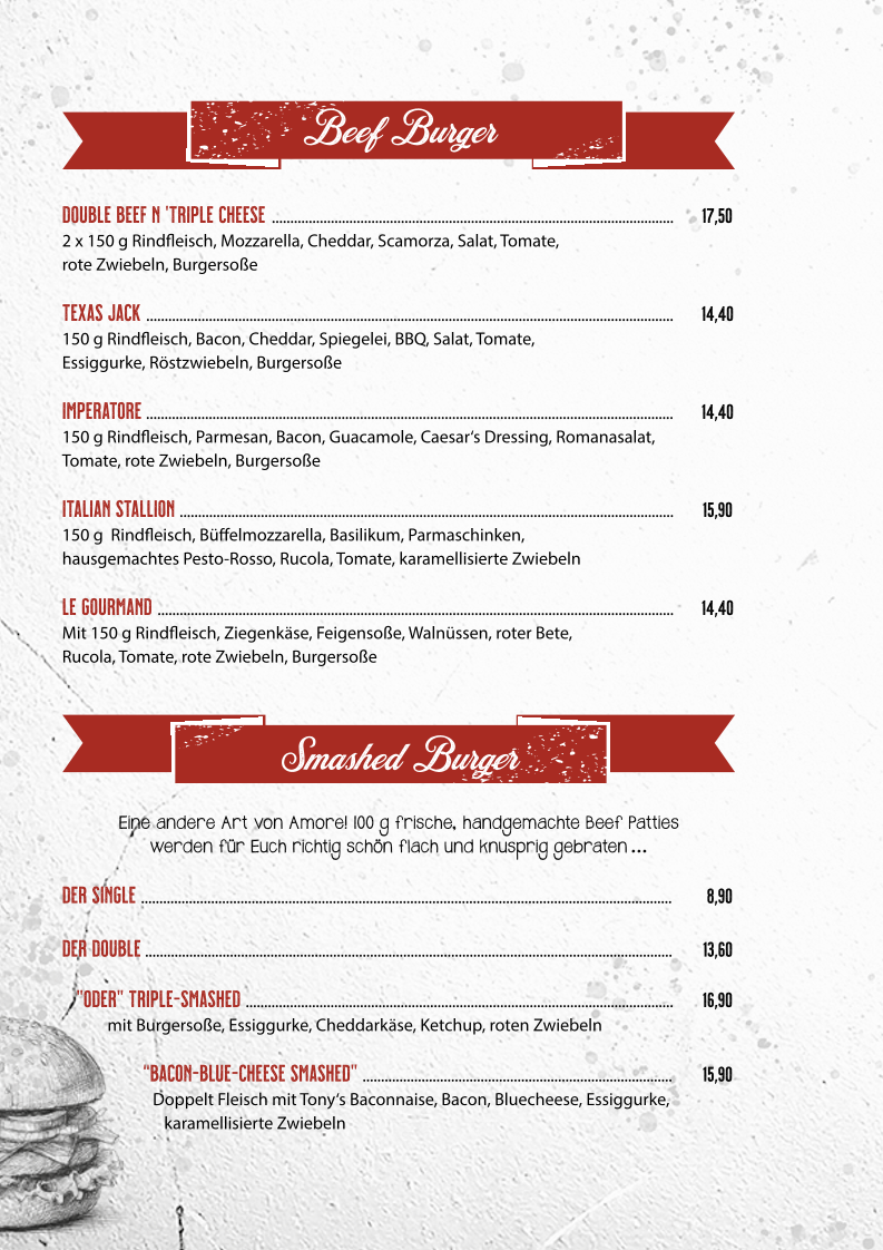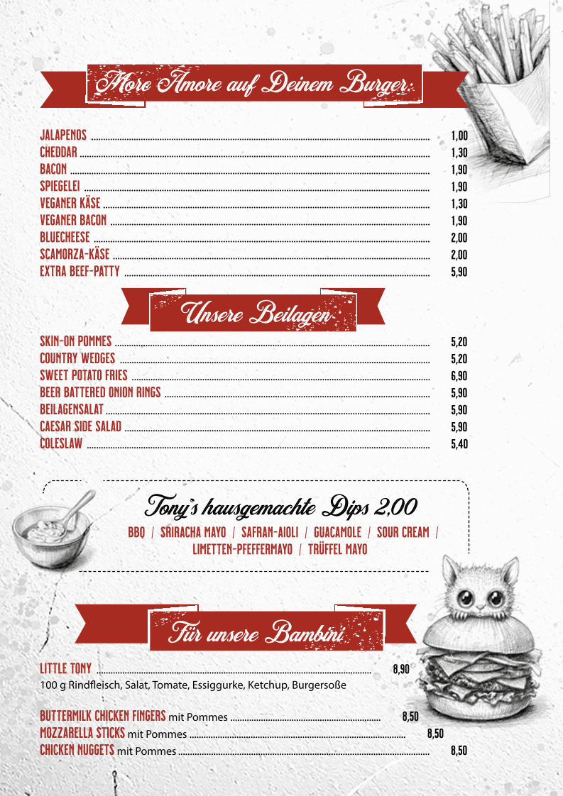 Tony's Burger & (A)More offers a diverse menu catering to a variety of tastes. For appetizers, they serve the refreshing Avocado Tartar. When it comes to snacks, the Rinder-Currywurst is a must-try for those who enjoy a spicy kick. Their burger selection is impressive, featuring the classic Classic Burger, the juicy Smashed Burger with the Der Single, and the crispy Hangry Bird for those craving chicken. Vegetarians are also well taken care of with options like the hearty Veggioso Veggie Burger and the flavorful Wunderlampe Vegan Burger. For the little ones, the Little Tony burger is a delightful treat. Fresh salads like the West Coast offer a light yet satisfying option. If you’re in the mood for something sweet, their Lava Cake is the perfect way to indulge. The menu also features sides such as Bresaola, Burrata, and Falafel Bällchen, as well as grilled vegetables and Cheese Fries. Whether you're in the mood for a classic burger or a more unique creation, Tony’s Burger & (A)More promises a satisfying meal for everyone.
