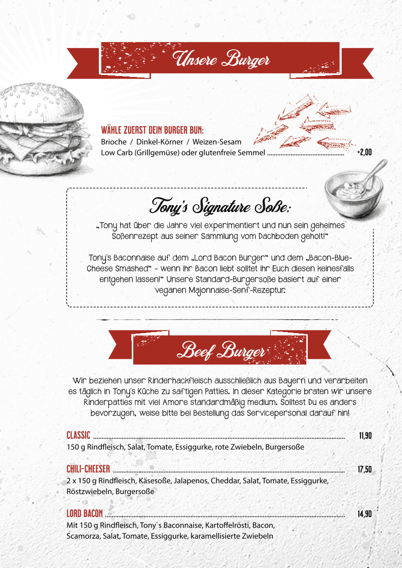 Mit 150 g Rindfleisch, Tony`s Baconnaise, Kartoffelrösti, Bacon, Scamorza, Salat, Tomate, Essiggurke, karamellisierte Zwiebeln